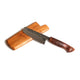 This is a hand forged carbon steel chef knife, designed with a very fine cutting edge and snub nose that specialises in accurately slicing through hard root vegetables. The handle is local macadamia, grown in Maleny Queensland, which has a polished finish and bronze bolster, cash in house from a mixture of recycled brass and copper. The sheath is salvaged cypress pine, which previously spent the last 80 years as a stud in a local home.