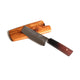 This is a high hardness high toughness stainless steel knife with a layered handle of micarta, a durable composite of compress paper and resin. It is designed as an all-round chef’s knife, with a fine cutting edge and slightly rolling blade. The layered handle has been finished with copper, bronze and brass pins, housed in a reclaimed cypress pine sheath.