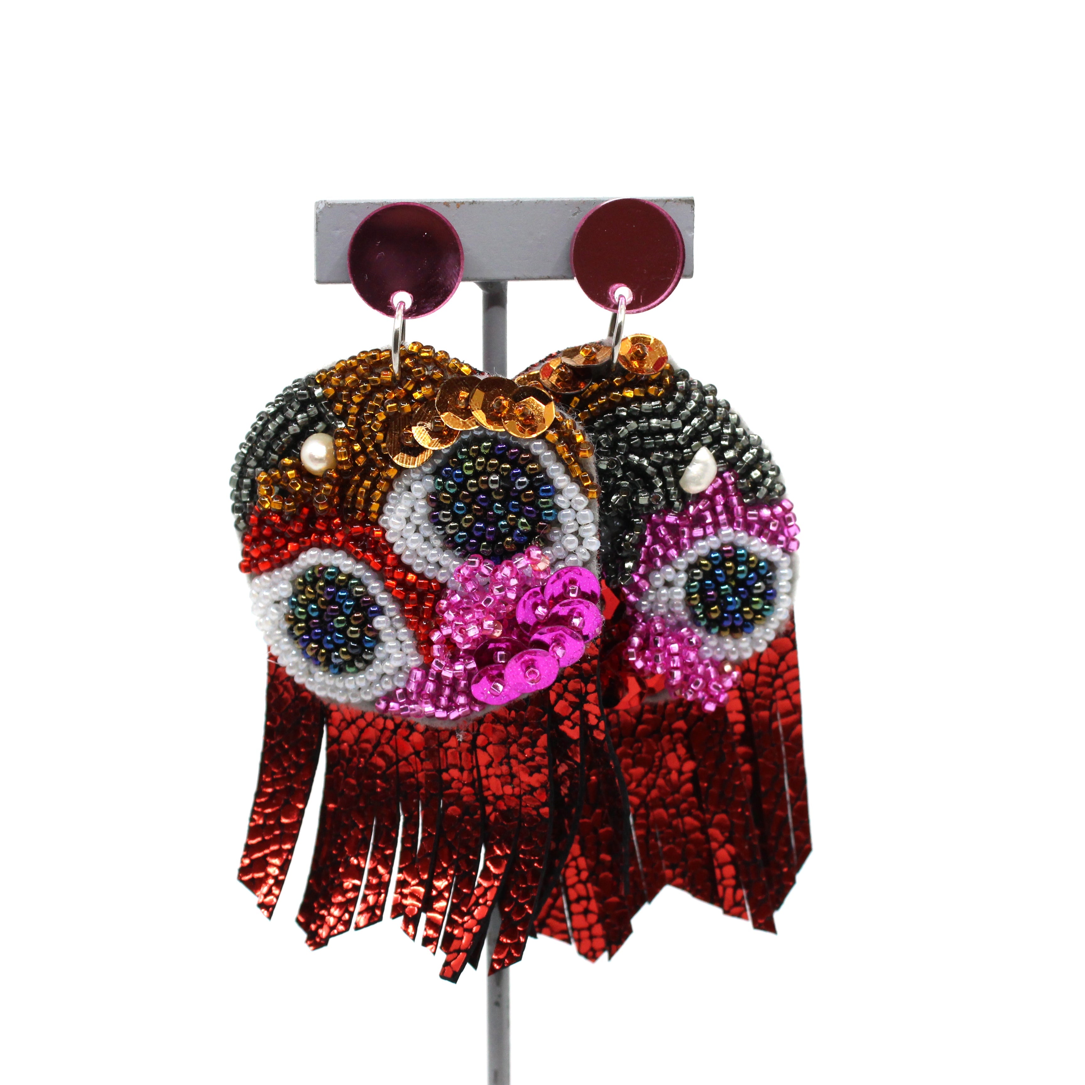Hand beaded using glass seed beads, pearls and using leather to finish them off. These earrings are a bright and bold abstract statement.