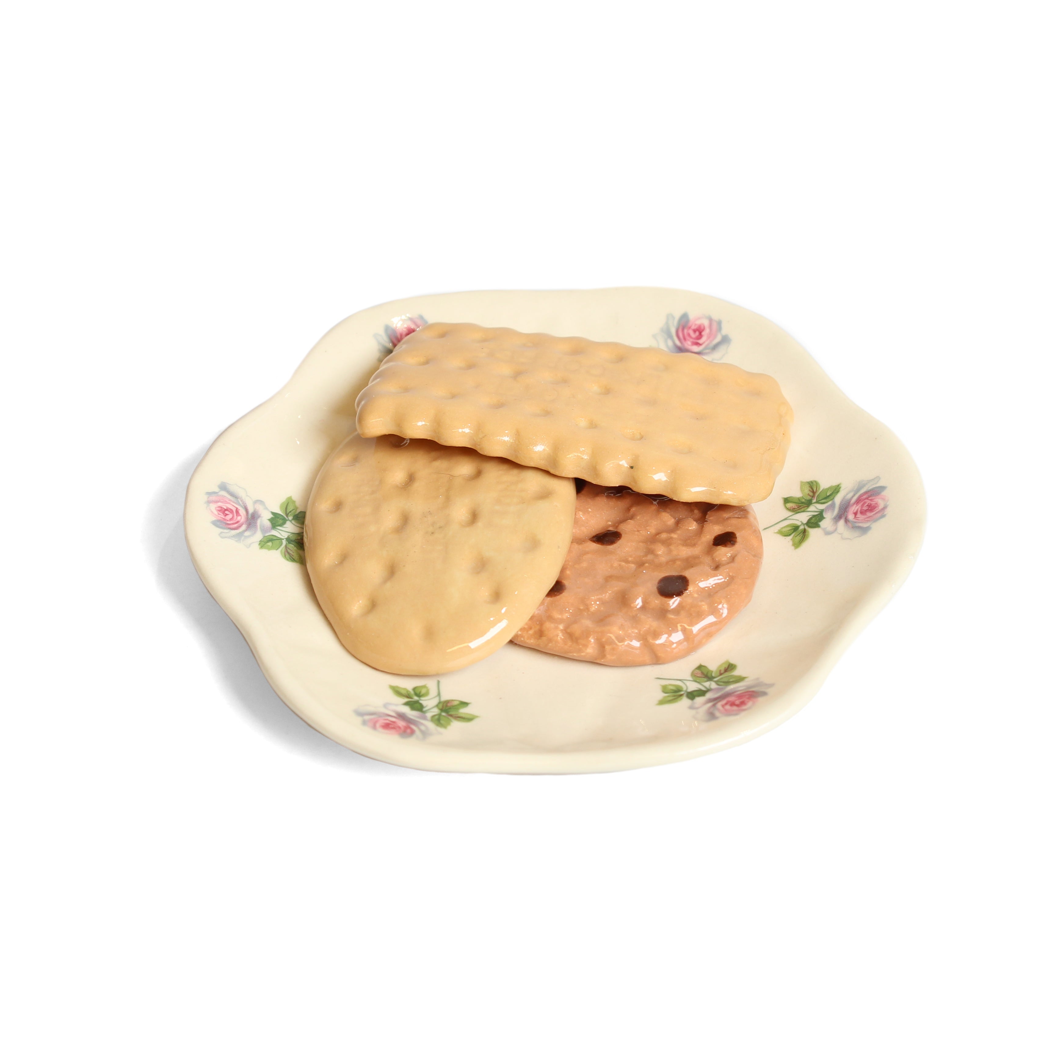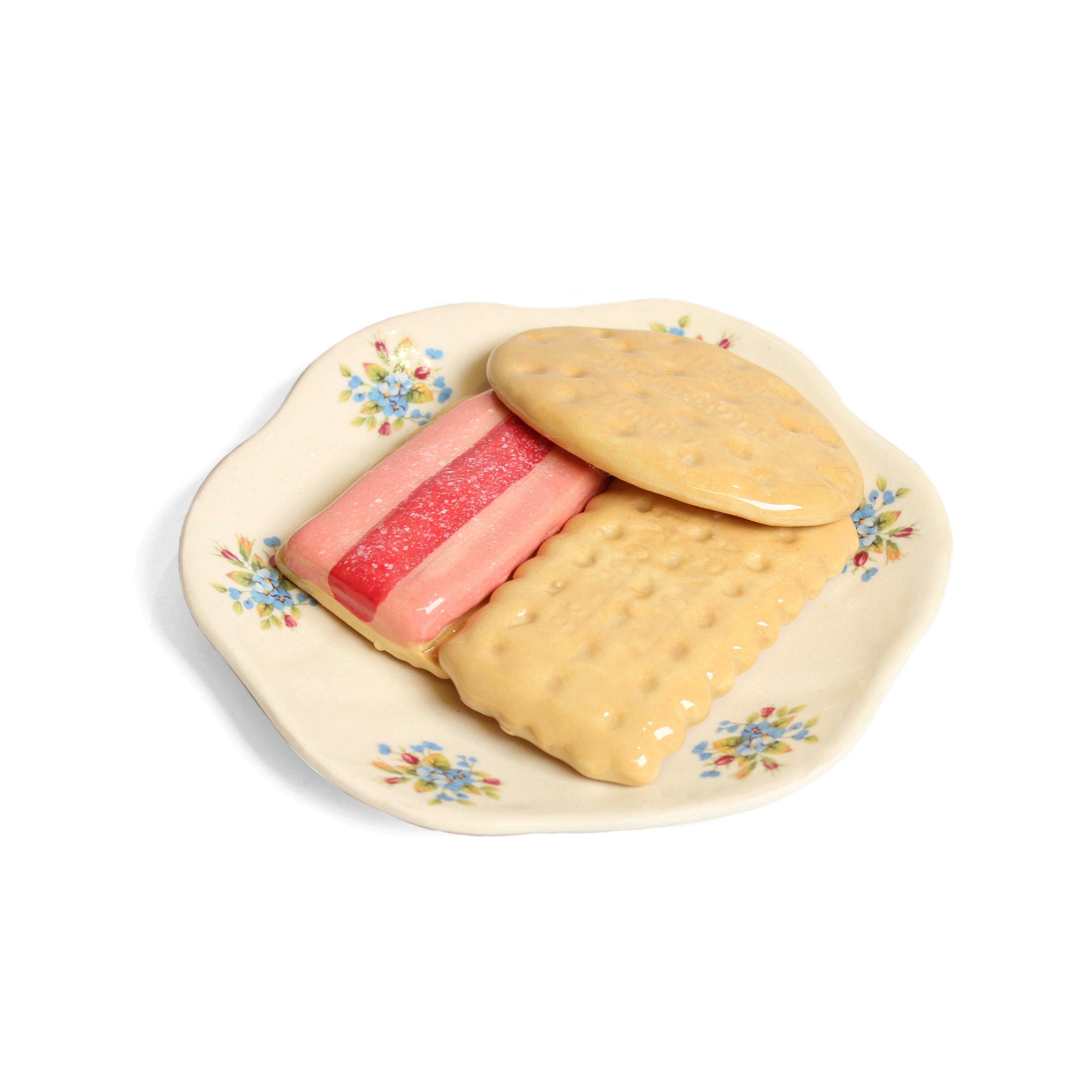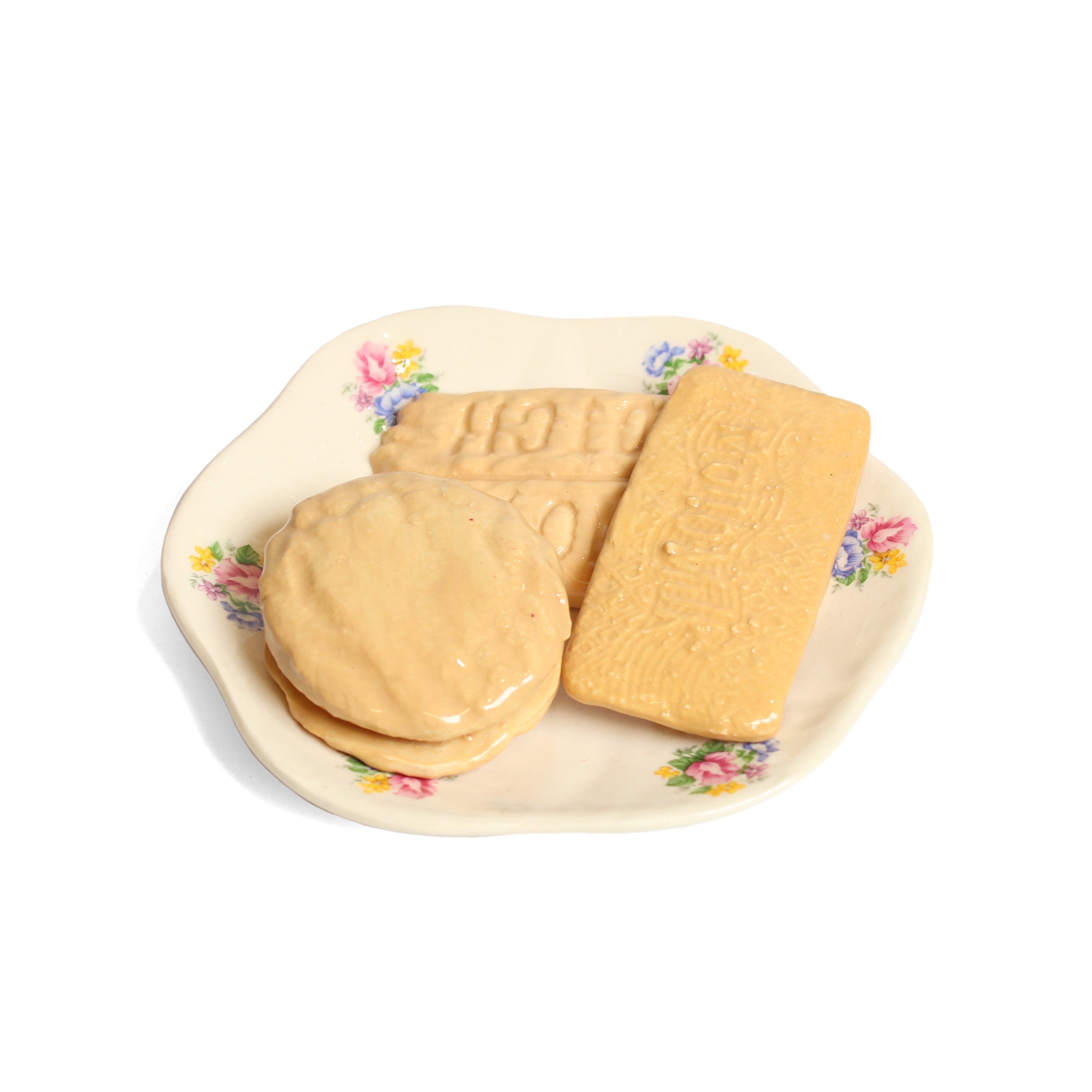 These deliciously inedible family favourite handmade biscuits are all individually crafted and sit atop handmade ceramic plates, adorned with vintage decals. Each plate contains three unique handmade biscuits.