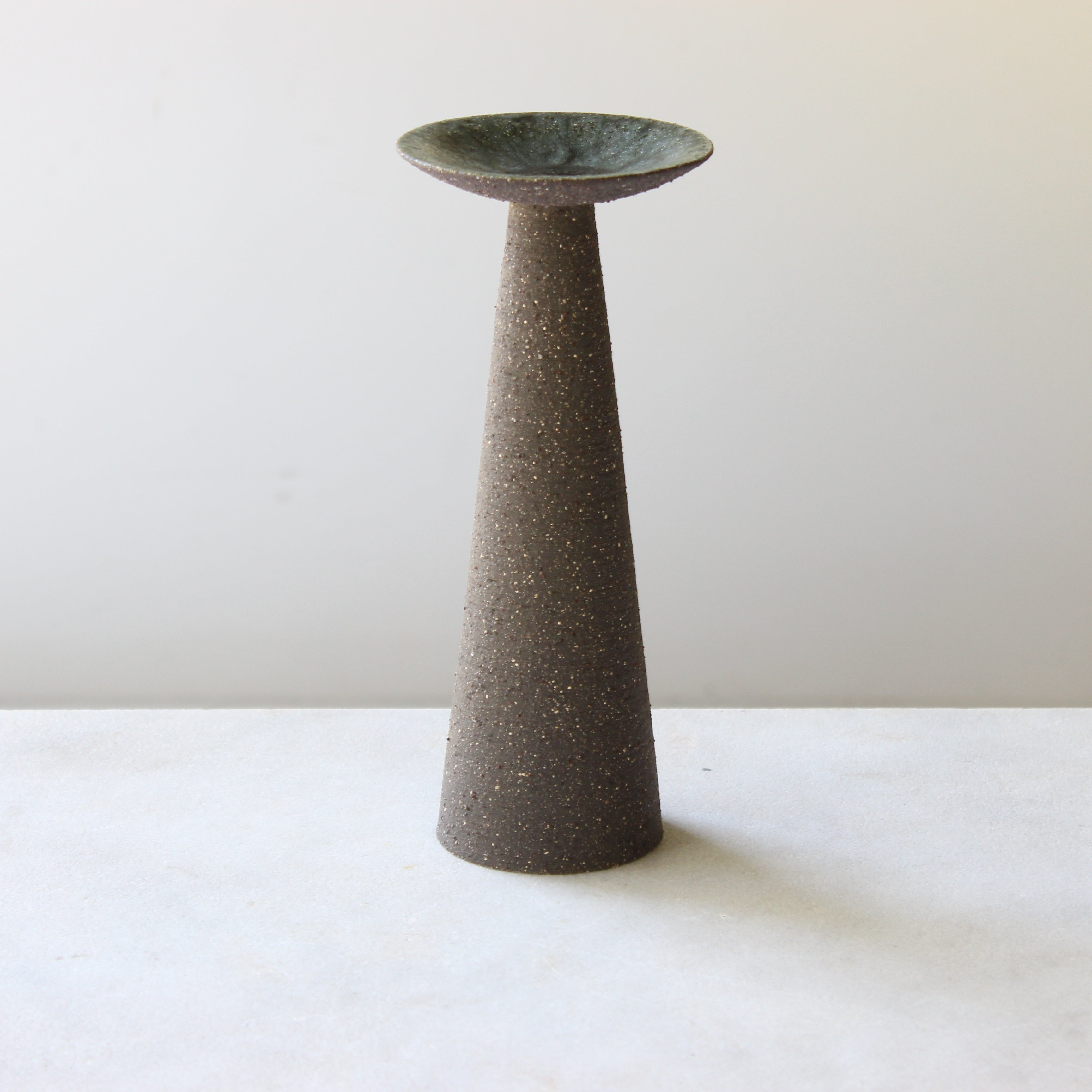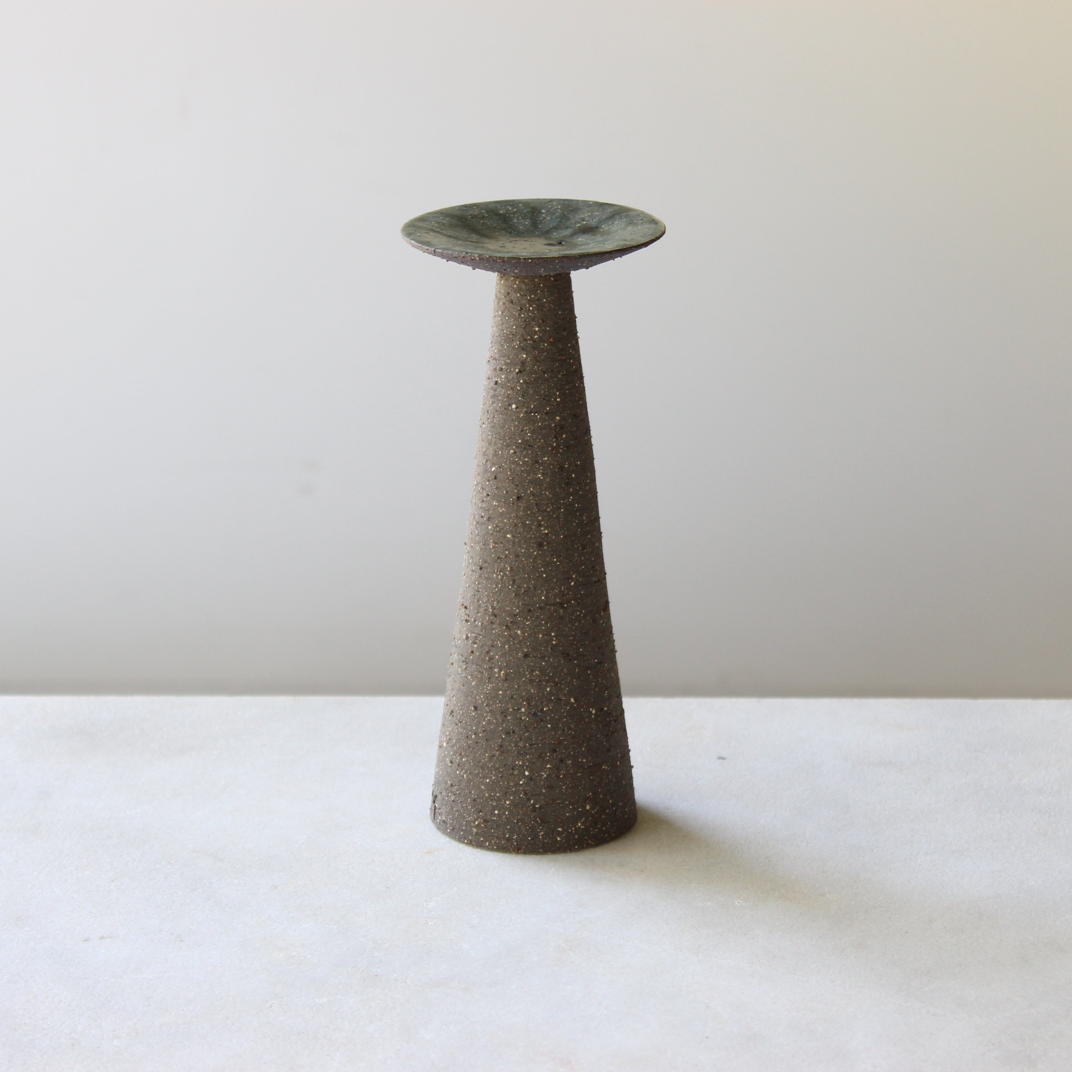 The exterior boasts a rich, dark stoneware surface, alive with a fine speckle and a subtle texture that invites touch. Atop each pillar, a shallow, concave dish is finished with a lustrous green ash glaze, where subtle variations in tone quietly draw the eye, creating a beautiful contrast and reflecting the soft glow of candlelight.