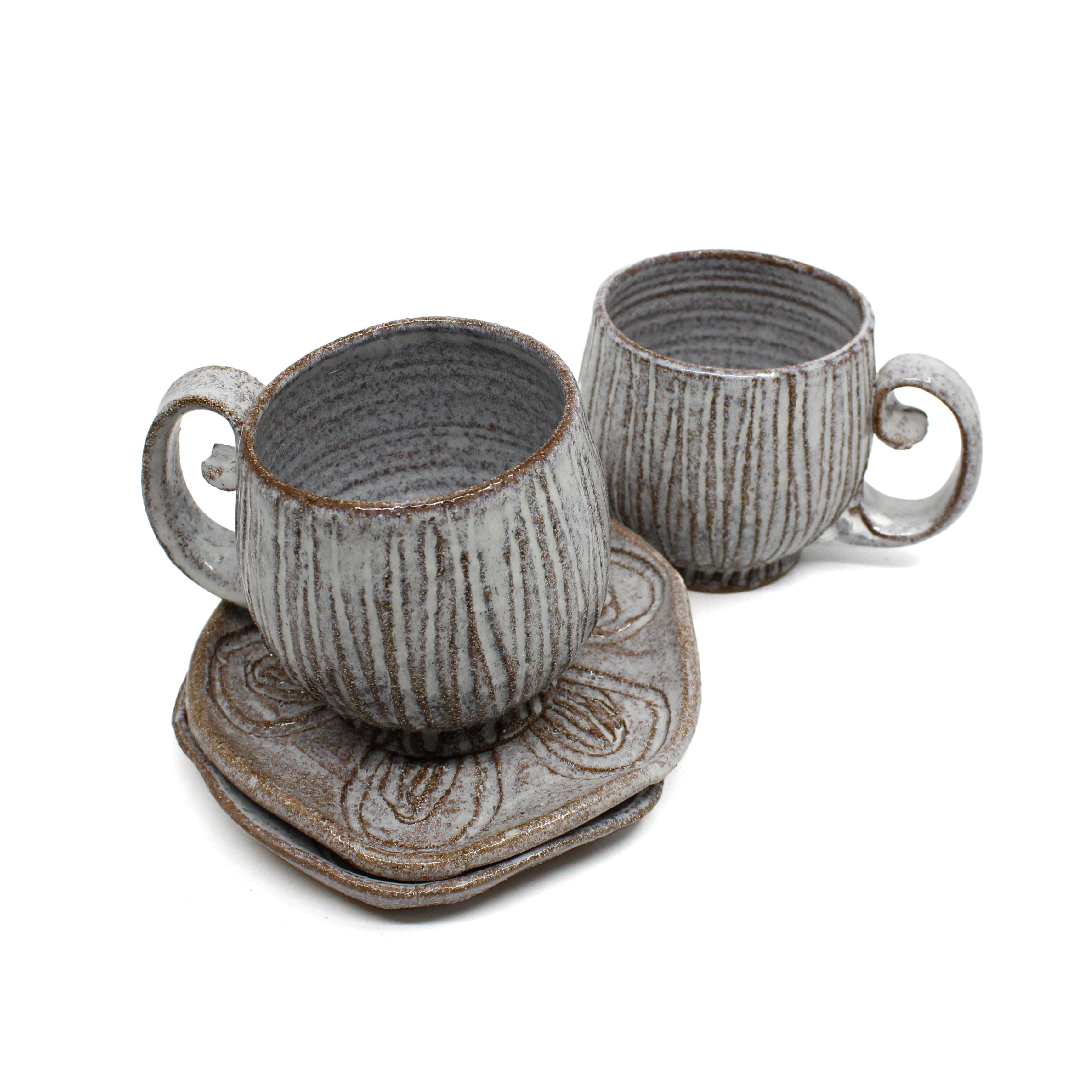 Wheel-thrown and handbuilt cup and saucer set using several layered glazes, by Southeast Queensland artist Carys Martin.