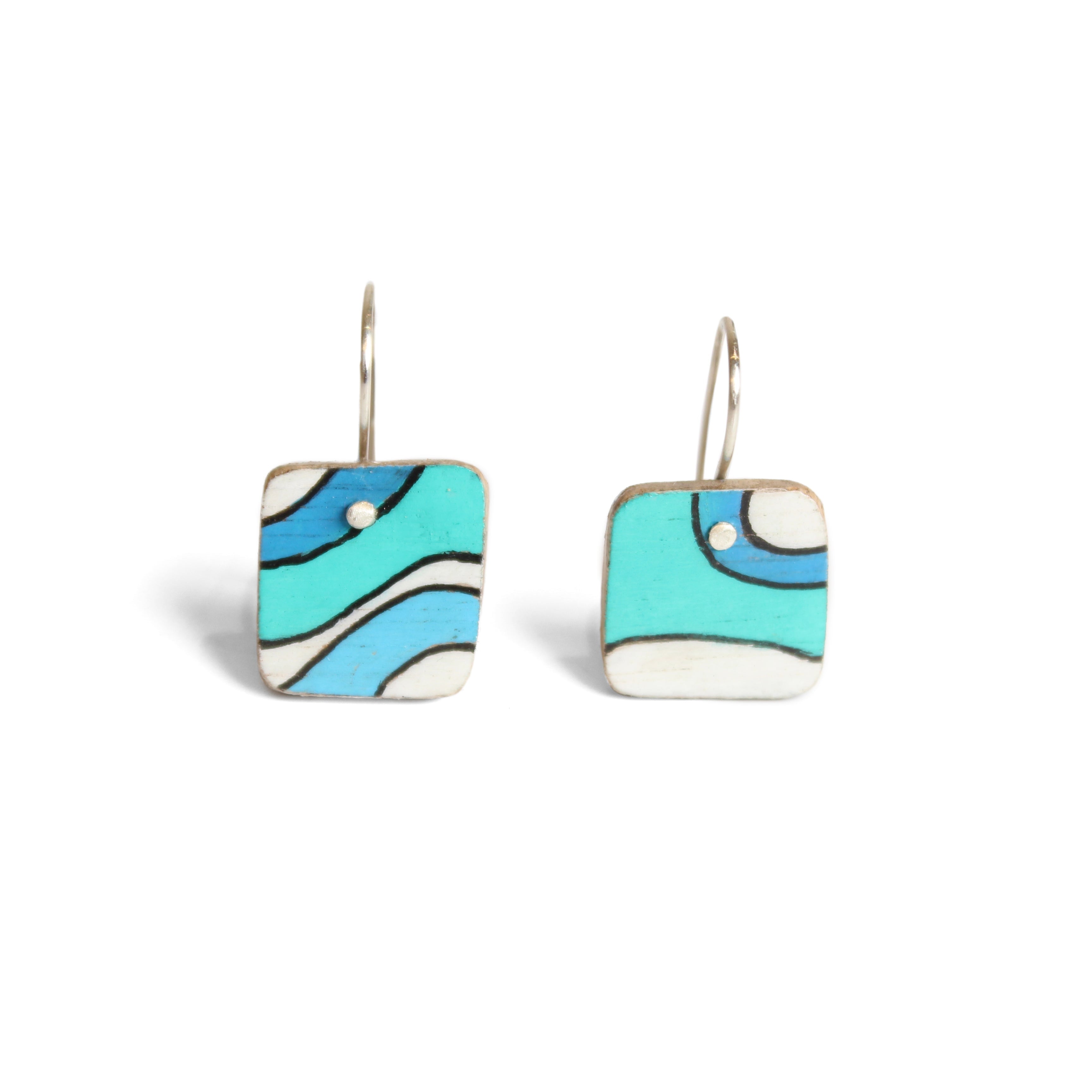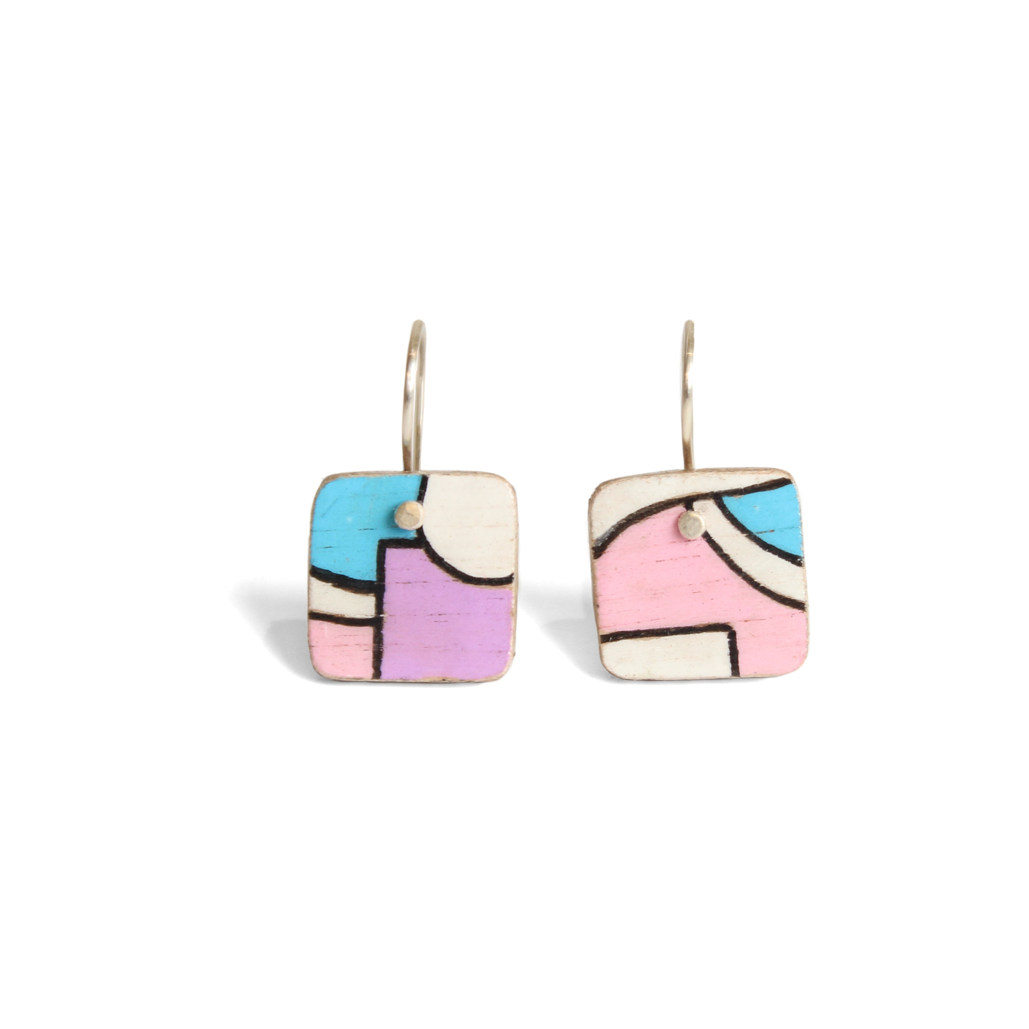 These unique earrings feature a hand-drawn Brisbane cityscape using coloured pencil and ink on plywood, coated with a high gloss varnish. Created by local artist Chloe Waddell.