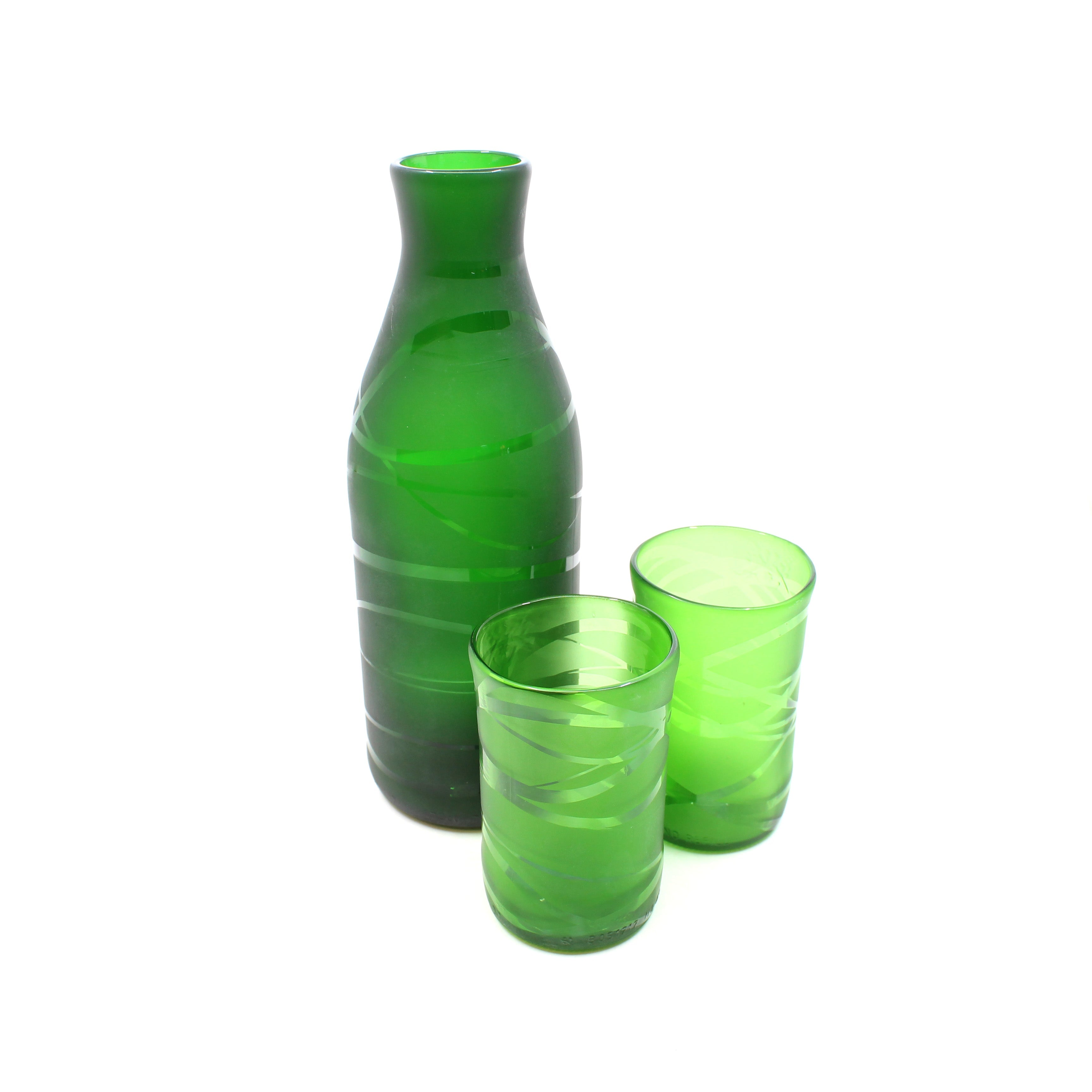 This set of 2 Carafe + 1 Tumbler is created using traditional hot glass techniques and surface modification to upcycle discarded bottles.
