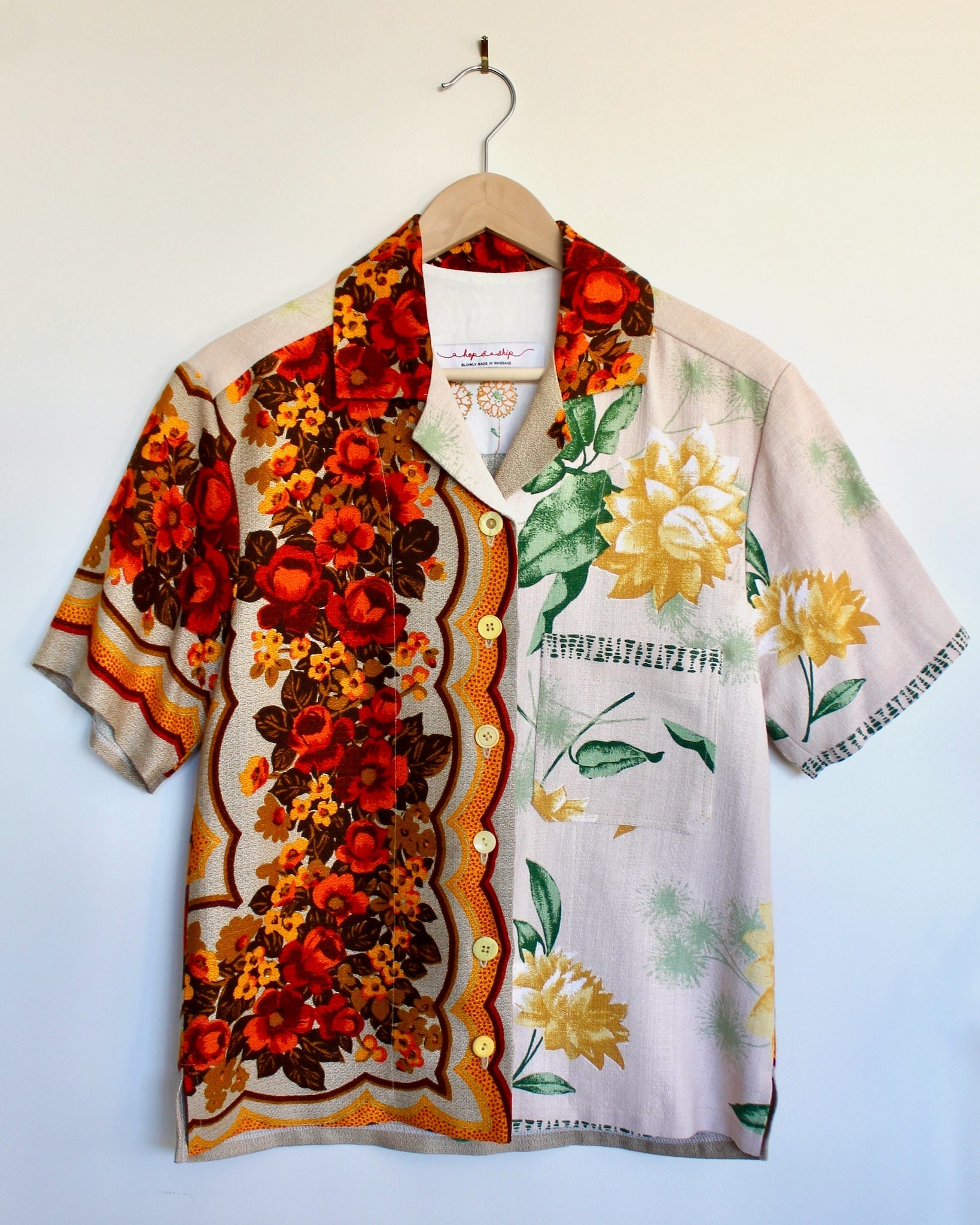 Gender neutral shirt made from vintage linens. Button front, short sleeve with one patch pocket and a Cuban collar.