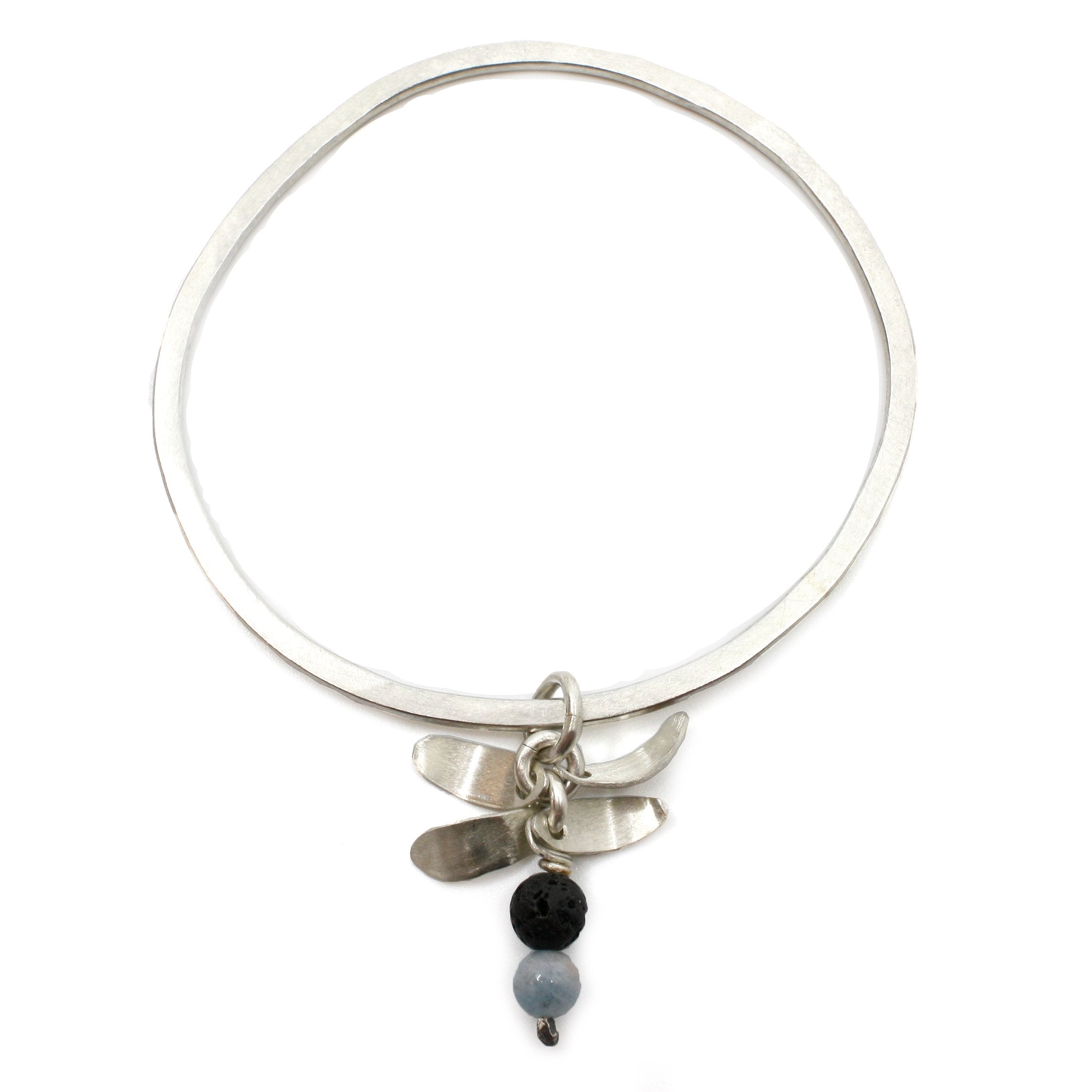 Go to the shopThis lovely bangle is constructed from flattened, thick .925 sterling silver, and features a drop charm of silver pinecone scales, aquamarine and black lava beads.